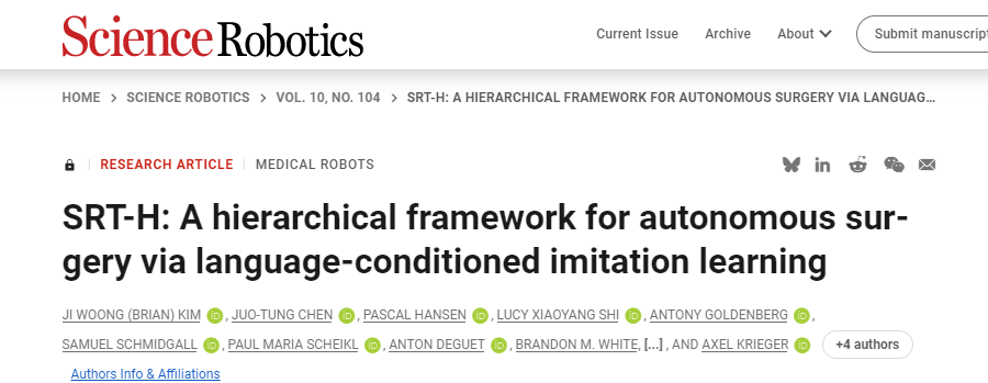 上周,Science 旗下机器人领域顶刊《Science Robotics》最新一期封面文章发表重磅成果:约翰霍普金斯大学团队的手术机器人 SRT-H(Hierarchical Surgical Robot Transformer),独立完成了 8 例胆囊切除术的关键步骤,成功率 100%!
