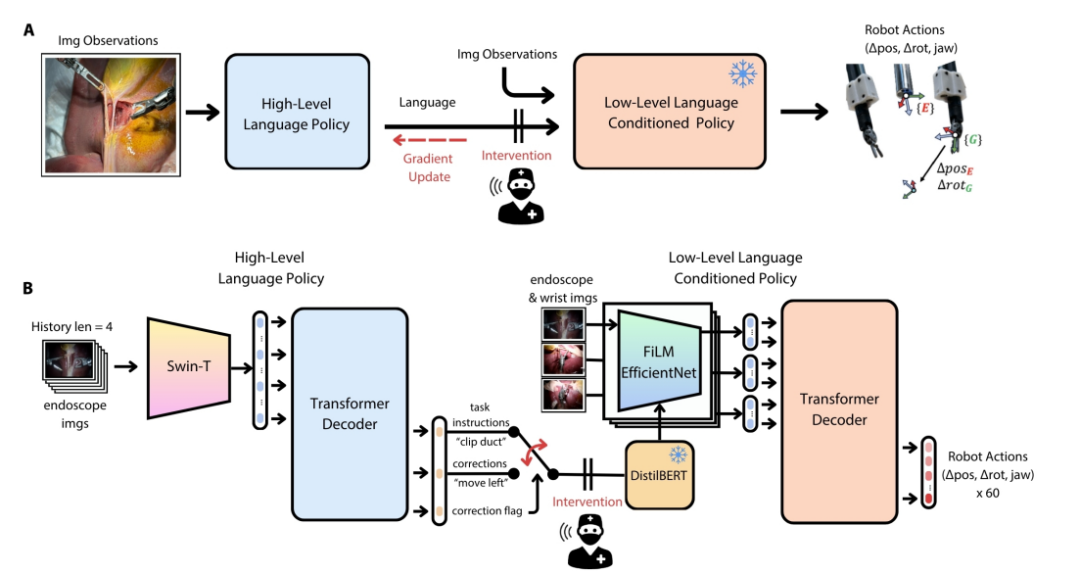 这种设计的巧妙之处在于语言的 “桥梁作用”:语言不仅是高低层沟通的媒介,还为人类干预提供了直观接口 —— 医生可随时用自然语言调整操作,而这些干预会通过 DAgger 风格的循环被系统 “记住”,用于持续学习优化。