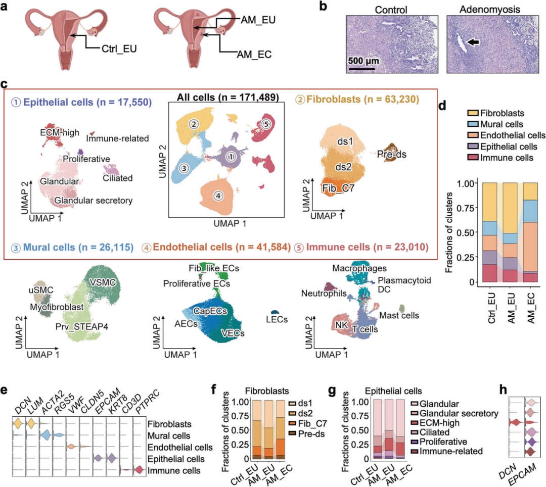 研究团队收集了13名接受子宫切除术女性的子宫内膜样本(7 个没有腺肌症,6 个有腺肌症)。通过对超过17万个细胞进行单细胞RNA测序分析。