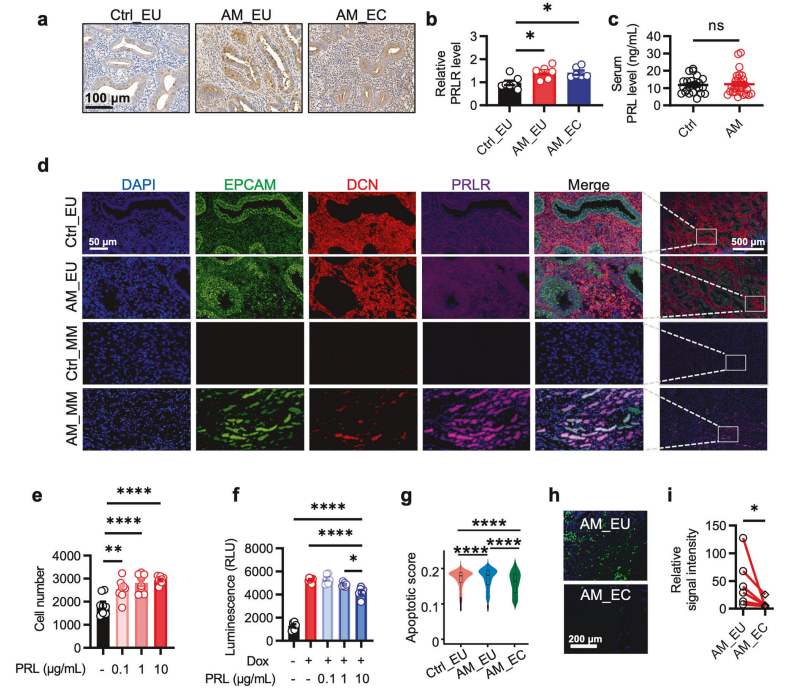 凋亡实验:用阿霉素诱导细胞凋亡,同时加入不同浓度 PRL后检测 Caspase-3/7 活性,结果显示 PRL 显著抑制上皮细胞凋亡。结合 scRNA-seq 数据中 AM_EC 上皮细胞凋亡评分降低、TUNEL 染色显示病灶凋亡信号弱于在位内膜的结果,明确 PRL 通过 “促增殖 - 抑凋亡” 推动病灶扩张。