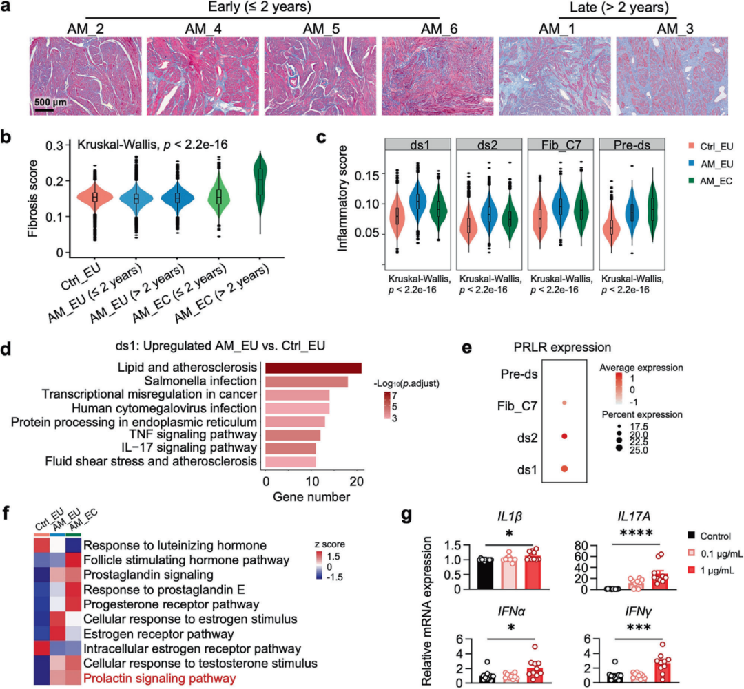 分析发现,腺肌病患者中 “ECM-high 上皮细胞” 亚群显著增多:这类细胞同时表达上皮细胞标志物(EPCAM)与成纤维细胞标志物(DCN),呈 “双面” 特征;且疾病病程>2 年患者的该细胞占比更高,更接近成纤维细胞特性。基因集变异分析(GSVA)显示,其对雌激素、催乳素(PRL)等多种激素信号通路高度敏感,其中催乳素受体(PRLR)表达尤为富集。