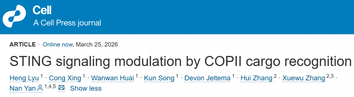 2026年3月25日,美国西南医学中心闫楠团队在Cell上发表了文章STING signaling modulation by COPII cargo recognition,揭示了STING内质网输出机制。