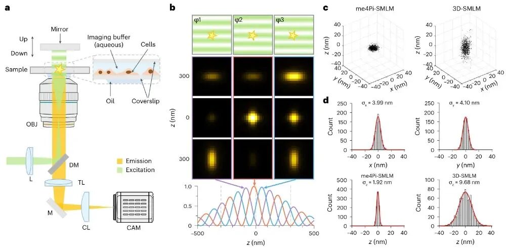 图1 me4PiSMLM的核心工作原理与系统可行性验证作者通过单物镜搭配反射镜形成轴向驻波干涉条纹,结合压电陶瓷驱动反射镜实现相位移动,并借助柱面镜引入像散完成轴向定位解模糊,同时以荧光微球为样品定量对比,证明该技术相比传统3DSMLM轴向定位精度提升约五倍,实现了2–3 nm的近各向同性定位精度。