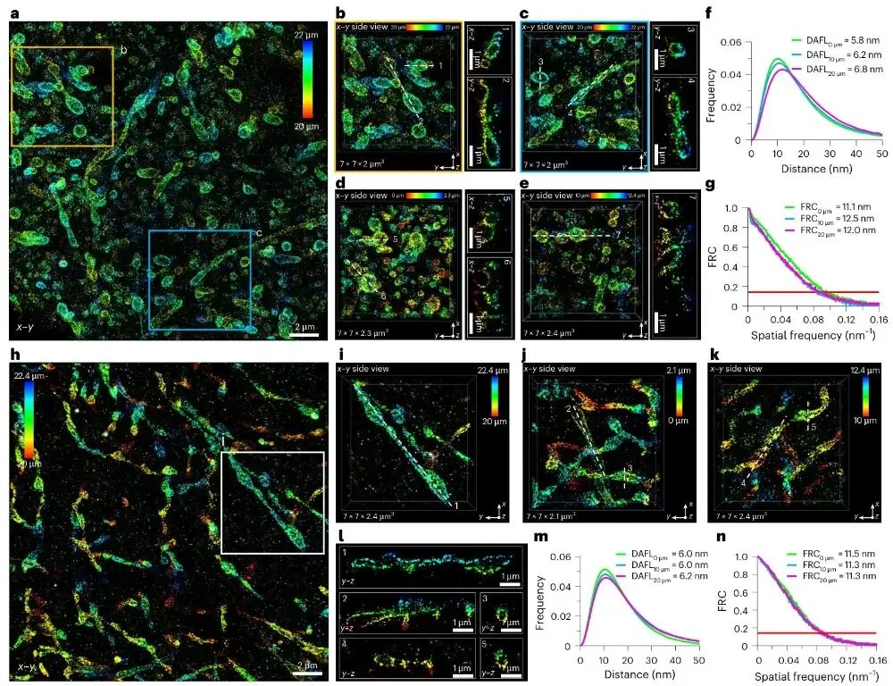 图4 me4PiSMLM的全细胞三维成像能力作者通过轴向层扫与图像拼接,成功对小鼠精母细胞联会复合体、HeLa细胞线粒体进行深度达数微米的全细胞三维重构,清晰呈现复杂超微结构的立体形态与空间分布,且在整个成像体积内保持稳定的高定位精度与分辨率,无明显伪影。