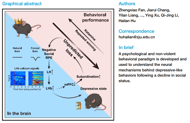2023年2月,团队在《Cell》上发表的研究,解决了一个大家都可能遇到的问题:为啥有些人在竞争中输了、地位下降了,就容易陷入抑郁?他们做了一个动物模型,让小鼠在不暴力的竞争中“被迫失败”,结果发现,小鼠会产生一种“负面奖励预测误差”(简单说就是“预期落空的失落感”),这种信号会通过下丘脑外侧区,激活大脑里的“反奖励中枢”——外侧缰核(LHb),进而抑制控制竞争力的内侧前额叶皮层(mPFC),让小鼠越来越“怂”、越来越退缩;而如果让小鼠重新赢回地位,这种抑郁样的行为,又能逆转回来。
