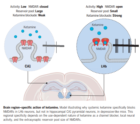 2024年8月,团队在《Science》上又有新发现,终于搞懂了氯胺酮快速抗抑郁的“秘密”。原来,氯胺酮特别“精准”,它只会阻断抑郁小鼠外侧缰核(LHb)神经元里的NMDAR受体,对海马锥体神经元里的这个受体,却一点影响都没有。而且这种“精准打击”,还和氯胺酮的使用方式、局部神经活动,以及NMDAR受体的“储备量”有关。如果把LHb里的NMDAR受体敲除,氯胺酮就没啥抗抑郁效果。这一发现,给设计更精准、更有效的抗抑郁治疗方案,指明了方向。