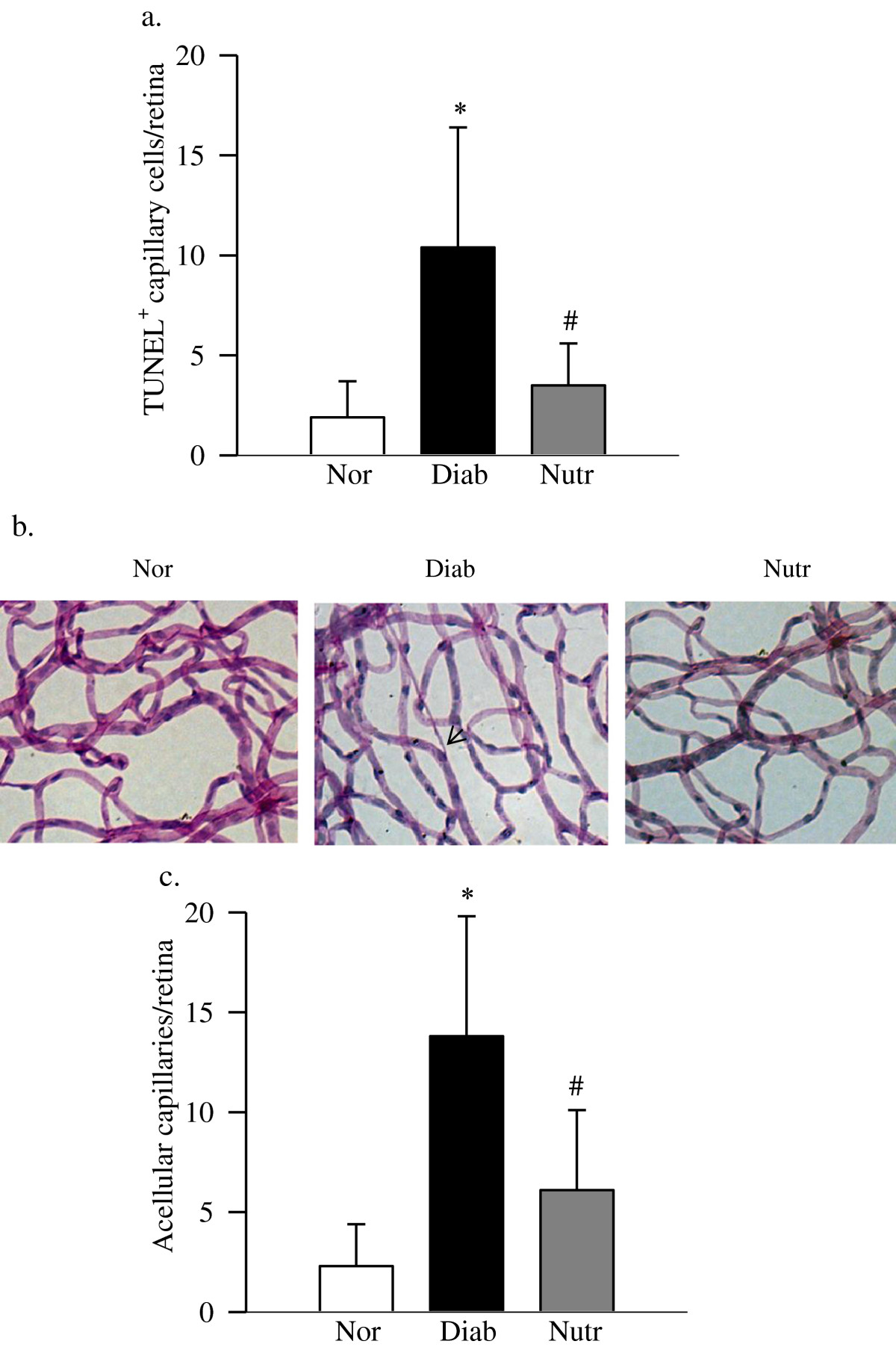 视网膜毛细血管细胞凋亡和组织病理学:从福尔马林固定的眼睛中分离视网膜并用水冲洗过夜。用含 200 mM 氟化钠的 3胰蛋白酶在 37°C 下消化视网膜 45-70 分钟以分离毛细血管。通过末端脱氧核糖核苷酸转移酶制剂 (TDT) 使用 dUTP 缺口标记染色 (TUNEL 方法) 检测凋亡血管细胞。在 TUNEL 反应开始之前,视网膜血管被 DNase 暴露作为阳性对照。 TUNEL 染色、希夫高碘酸盐和苏木精染色的血管和组织学评估。计算视网膜中央区域无细胞毛细血管的数量,并将它们表示为视网膜中的无细胞毛细血管。